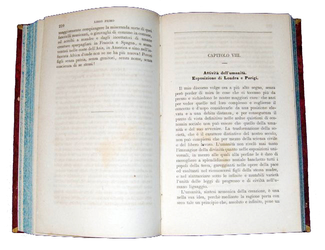 [2.]: 8vo (180x108 mm), half percalline cloth binding and marbled paper at boards, title at spine, blue sprinkled edges; 2 vols.; pp. 434; 428. Work belonging to the collection: "Biblioteca educativa per il popolo italiano".