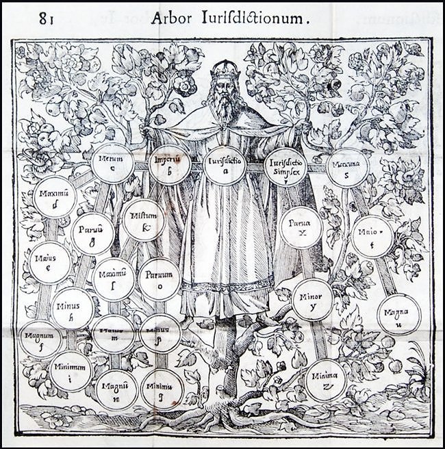 [1.]: 4to (248x174 mm), contemporary full vellum, three raised bands at spine, calligraphic title at bottom edge; pp. [172], 1493 [i.e. 1509], [1] leaf of folded table. Title-page and text in red and black types. A printers' device at title page, with the symbols (Pace, Occhio, Pazienza, Salamandra) and the initials (FS, GB, NB, DZ) of the printers (F. De Franceschi, G.Bindoni il vecchio, eredi di N. Bevilacqua e D. Zenaro). Xylographic initials and ornaments. Folded table between p. 80 and 81 with an engraving representing the tree of jurisditions (Arbor Iurisdictionum).