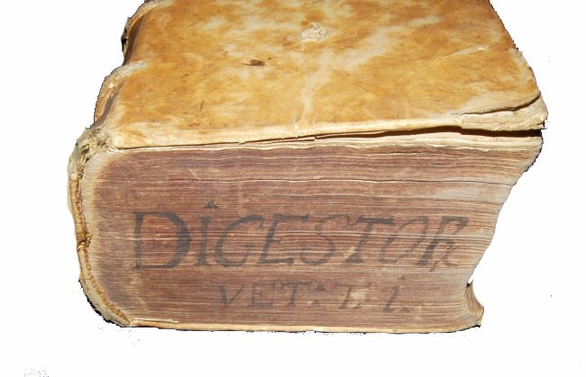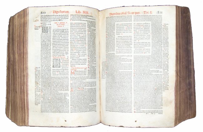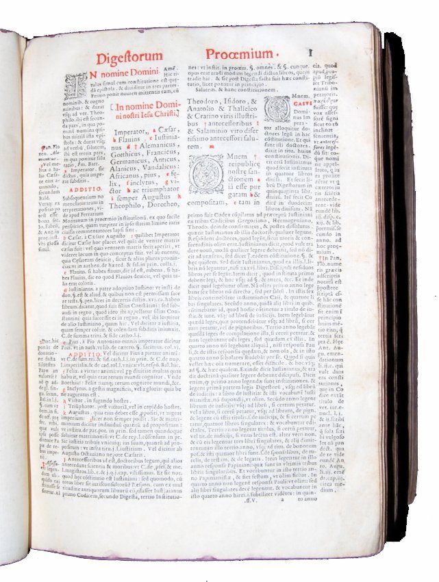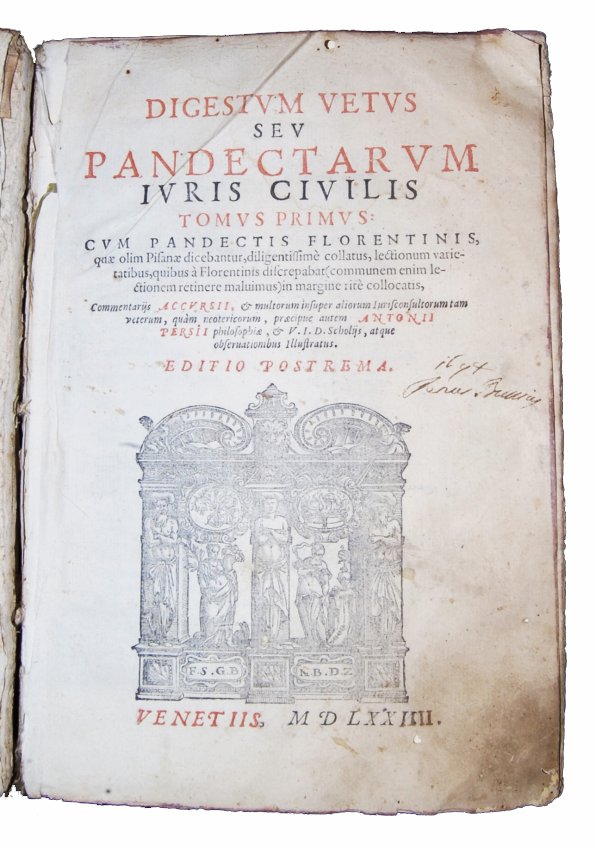 [1.]: Iustinianus Augustus - Accursius - Persius. Digestum vetus seu Pandectarum iuris ciuilis tomus primus [...] Commentarijs Accursii, et multorum insuper aliorum iurisconsultorum tam veterum, quam neotericorum, praecipue autem Antonii Persii scholijs, atque obseruationibus illustratus. Editio postrema. Venetiis: [Francesco De Franceschi, Gaspare Bindoni il vecchio, eredi di Niccolò Bevilacqua, Damiano Zenaro], 1575 (Venetiis: 1574).