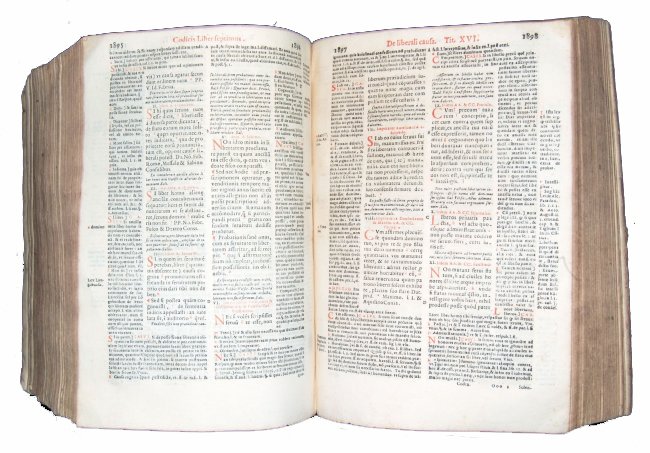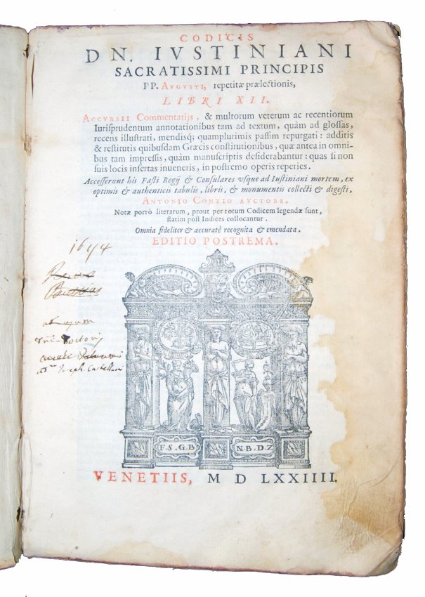 [2.]: Iustinianus Augustus - Accursius - Leconte. Codicis dn. Iustiniani sacratissimi principis pp. Augusti repetitae praelectionis libri XII. Accursii commentarijs, & multorum veterum ac recentiorum iurisprudentium annotationibus tam ad textum, quam ad glossas, recens illustrati , mendisque quam plurimis passim repurgati: additis & restitutis quibusdam Graecis constitutionibus, [...] Accesserunt his Fasti regij et consulares vsque ad Iustiniani mortem [...] Antonio Contio auctore. Editio postrema. Venetiis: [Francesco De Franceschi, Gaspare Bindoni il vecchio, eredi di Niccolò Bevilacqua, Damiano Zenaro], 1574.