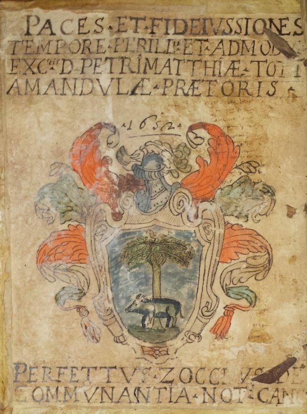 Provenance: The copy belonged to Mattia Toti, praetor of Amandola, (his painted coats of arms? at first inner cover) according to the inscriptions Petri Matthiae Toti Amandulae Pretoris. Amandola is a municipality in the Province of Fermo in the Italian region Marche. The town was founded in 1248 by the union of the castles of Agello Leone and Marrubbione, which formed a free municipality.