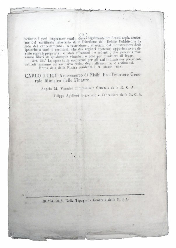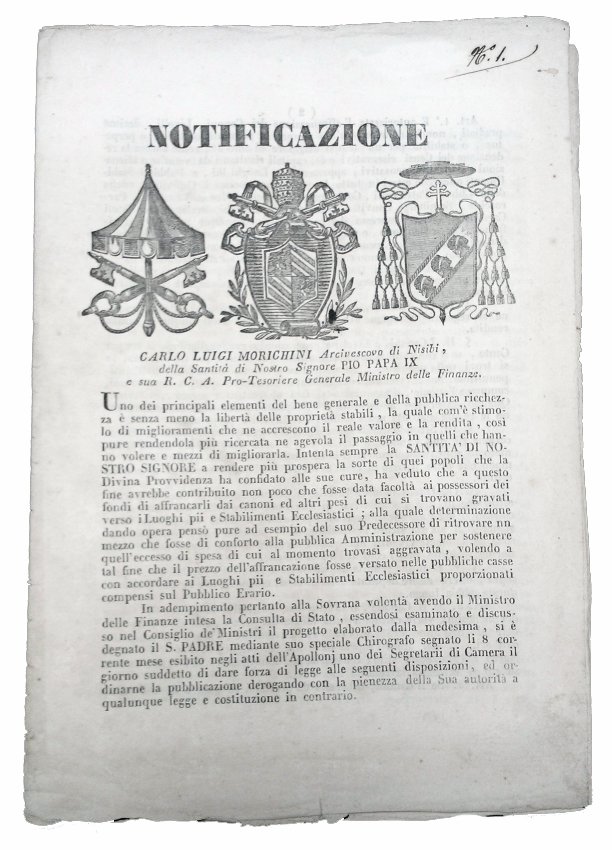 [3.]: Papal States: Ministry of Finance - cardinal Morichini. Notificazione: Carlo Luigi Morichini Arcivescovo di Nisib, della Santità di nostro signore Pio Papa IX. a sua R.C.A. Pro-Tesoriere Generale Ministro delle Finanze. Roma: nella Tipografia Generale della R.C.A., 1848.