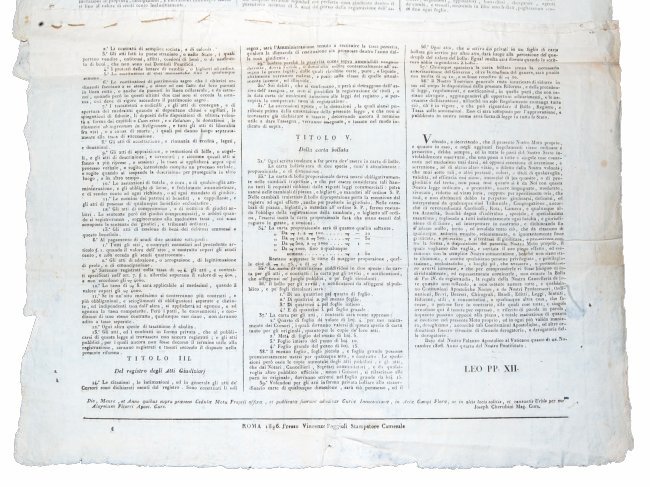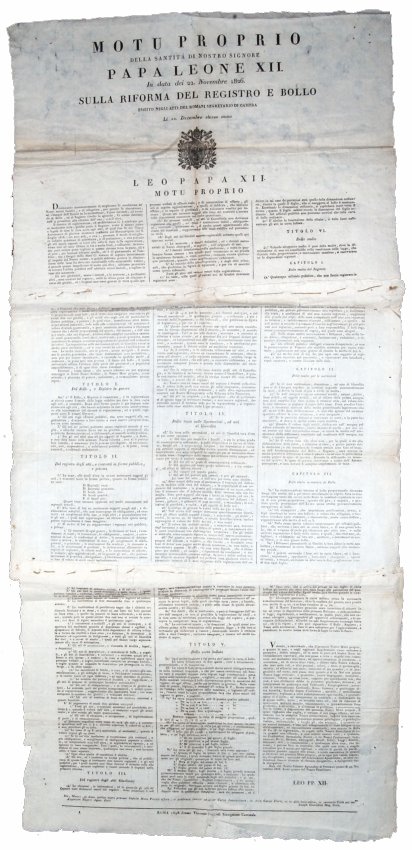 [2.]: Papal States - Pope Leo XII. Motu proprio della santità di nostro signore papa Leone XII. in data dei 22 novembre 1826 sulla riforma del Registro e Bollo esibito negli atti del Romani segretario di Camera Li 22 Decembre stesso anno Roma: presso Vincenzo Poggioli stampatore camerale, 1826.