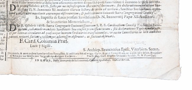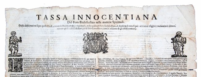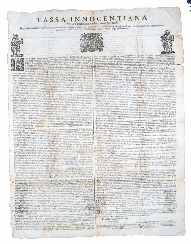 [1.]: Roman Curia - Sacred Congregation of the Council - cardinal Colonna (Prefect). Tassa innocentiana del foro ecclesiastico nelle materie spirituali. Ouero dichiarationi sopraquelle cause, e materie ecclesiastiche, e spirituali, nelle quali nel foro ecclesiastico, & episcopale non si può nè si deue esiggere emolumento alcuno, eccetto quello che si dichiara per il solo cancelliero, con la riforma de gli abusi contrarij. Roma: nella stamperia della Reverenda Camera Apostolica, 1678.