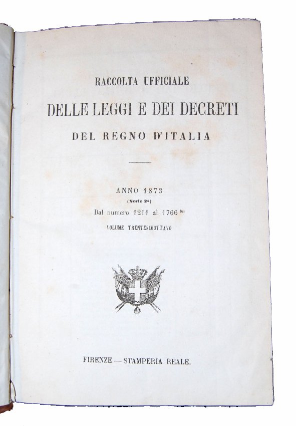 [4.]: Raccolta ufficiale delle leggi e dei decreti del Regno d'Italia. Anno 1873 (serie 2°) dal numero 1211 al 1766bis. Volume trentesimottavo. Firenze: Stamperia Reale, [1873].