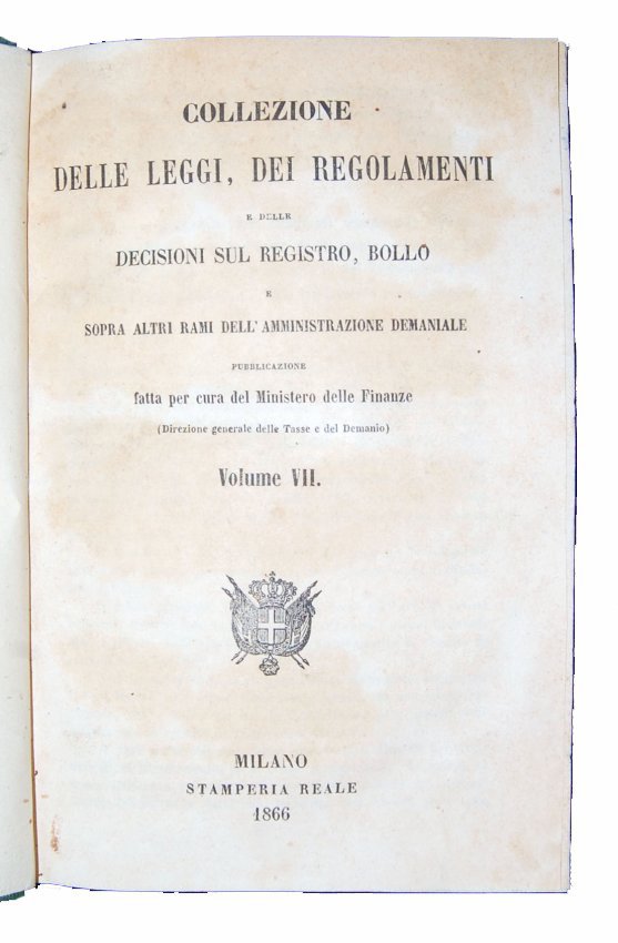 [1.]: Collezione delle leggi, dei regolamenti e delle decisioni sul registro, bollo e sopra altri rami dell'amministrazione demaniale. Pubblicazione fatta per cura del Ministero delle Finanze (Direzione Generale delle Tasse e del Demanio). Volume VII. (-VIII). Milano: Stamperia Reale, 1866.