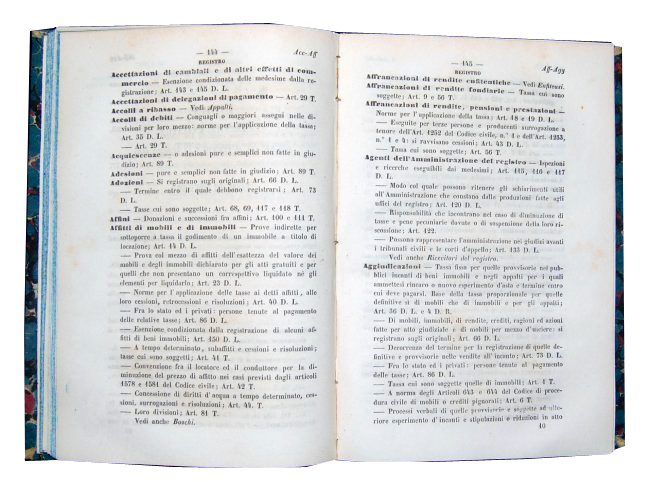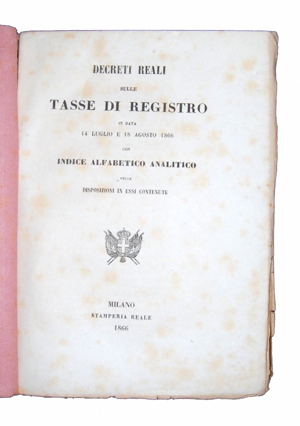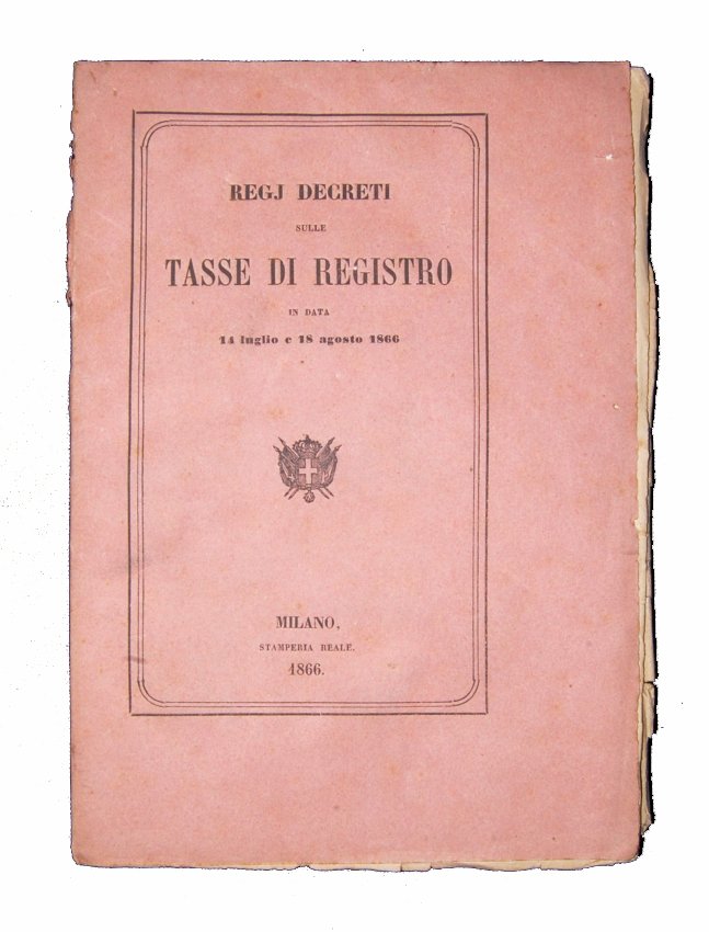 [2.]: Decreti reali sulle tasse di registro in data 14 luglio e 18 agosto 1866 con indice alfabetico analitico delle disposizioni in essi contenute. Milano: Stamp. Reale, 1866.
