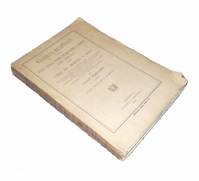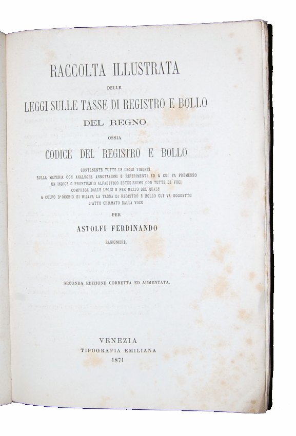 [3.]: Astolfi, Ferdinando. Raccolta illustrata delle leggi sulle tasse di registro e bollo del Regno ossia codice del registro e bollo contenente tutte le leggi vigenti sulla materia con analoghe annotazioni e riferimenti ed a cui va premesso un indice o prontuario alfabetico estesissimo con tutte le voci comprese dalle leggi e per mezzo del quale a colpo d'occhio si rileva la tassa di registro e bollo cui va soggetto l'atto chiamato dalla voce per Astolfi Ferdinando. Seconda edizione corretta ed aumentata. Venezia: Tipografia Emiliana, 1871.