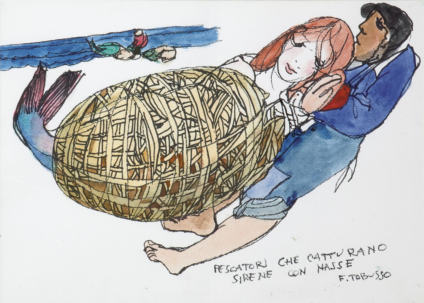 TABUSSO FRANCESCO (Sesto San Giovanni (MI) 1930) - "Pescatori che catturano sirene con masse", 35X49 tecnica mista su carta. Opera firmata ed intitolata in basso a destra