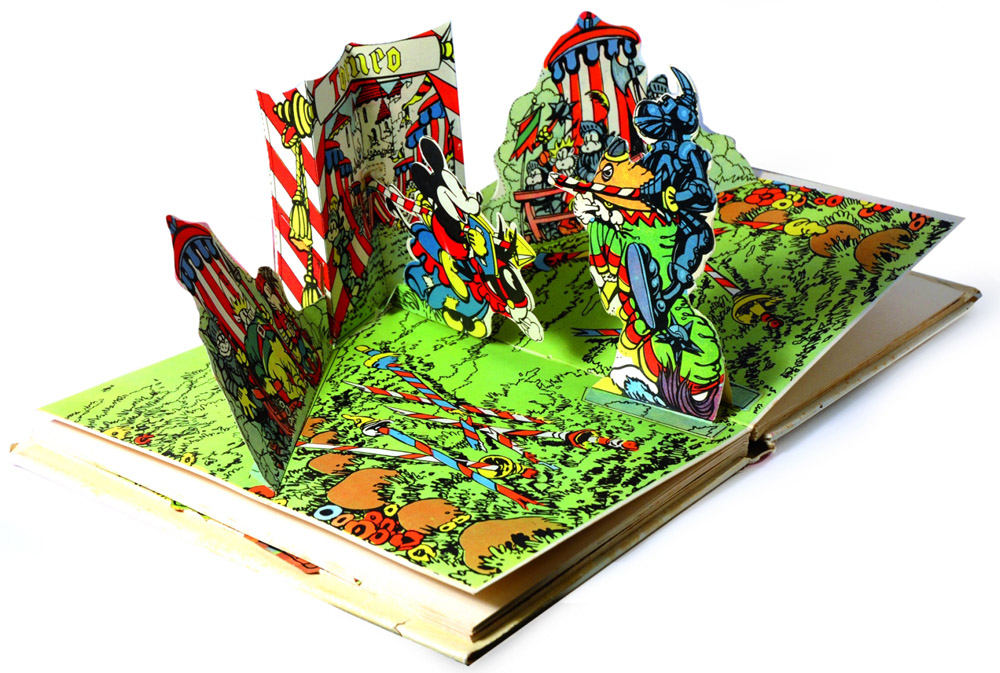 Mondadori, Milano 1935. Cm 19x25, pp. 54 illustrate in b/n n.t. e con 11 tavole in b/n f.t.; copertina cartonata e sguardie illustrate a colori. Quattro illustrazioni pop-up a doppia pagina si alternano al testo illustrato. Nuovo, completo della sovraccoperta. Raro in questo stato.