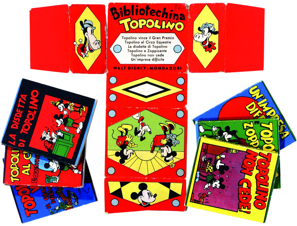 Lot of the complete Bibliotechina Topolino, 6 paperback books, each 40 pages; overall very good conditions, small lack at bottom back margin of first book; complete with its Antonio Rubino decorated case