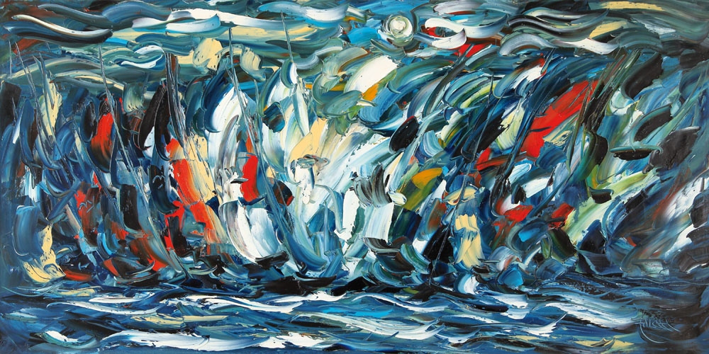 MARIO FALCHI Porto Maurizio 1950 Regata, 2009 olio su tela cm. 60x120, firma in basso a destra, titolo, firma e anno al retro, dichiarazione d'autenticità dell'artista su foto.