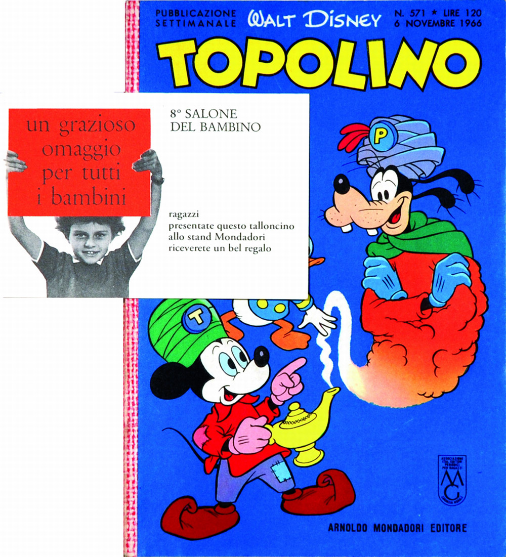 del 6 novembre 1966. Pubblica: Paperino e il tocco di Mida di Chierchini; Pippo e la mancia di tasca propria e La lampada del lustrascarpe di Murry. Conservazione eccellente, completo del raro tagliando dell’ottavo Salone del Bambino.