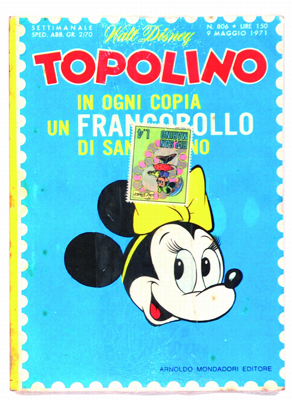 9 maggio 1971 in blister originale con allegato il francobollo di San Marino di Minnie. Si segnala un’apertura circolare al retro del blister e un segno di reggetta all’albo e piccole ingialliture.