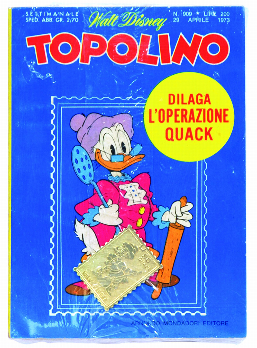 29 aprile 1973 in blister originale con francobollo L’operazione Quack! di Nonna Papera. Piccolo foro da sfregamento al blister anteriore per altro blister e albo perfetti.