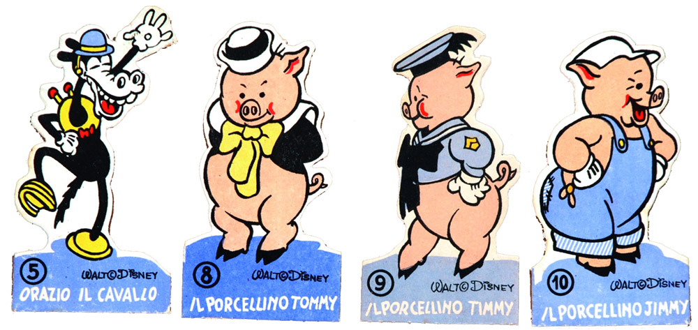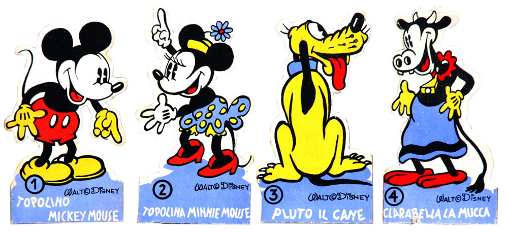 Bombon di fama mondiale, 1935. Edizioni La Lito Milano. Furono edite 24 figurine sagomate cm 6x11 circa. Lotto composto dai nn.1) Topolino, 2) Topolina, 3) Pluto, 4) Clarabella, 5) Orazio, 8) Il porcellino Tommy, 9) Il porcellino Timmy, 10) Il porcellino Jimmy, 11) Il Lupo Mannaro, 12) L’Uccellino Impertinente, 13) L’Anitra Litigiosa, 15) Pinguini Innamorati, 23) Papà Natale, 24) Nel Paese delle Fate. Eccellente stato.