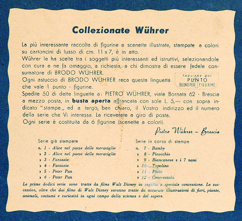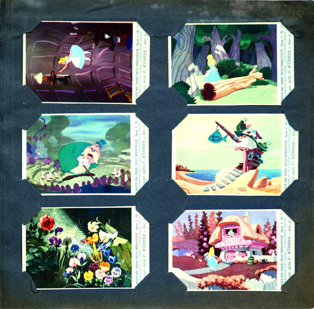 Album-raccolta cm 30x27, completo di 11 serie, ciascuna composta da 6 figurine formato Liebig, cm 11x7: serie 1a e 2a Alice nel Paese delle Meraviglie, serie 3a Fantasie, serie 5a e 6a Peter Pan, serie 7a Bambi, serie 8a Bongo e i Tre Avventurieri, serie 9a Cenerentola, serie 10a I Tre Caballeros. Complessive 60 figurine in eccellente stato, album in stato di nuovo, lievi tracce di umidità alla c.p. Il più raro album di figurine disneyane.