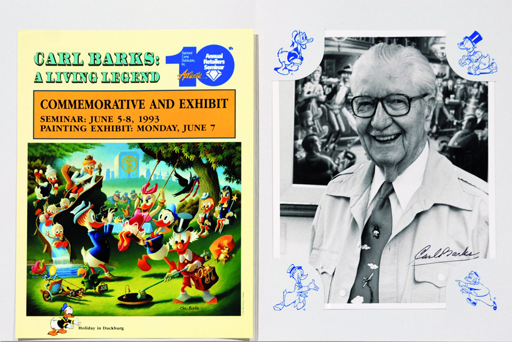 Autographed Carl Barks photo in limited numbered (82/1092) edition commemorating the 10th Annual Diamond Comic Distributors convention in June 1993. Along with an advertisement booklet in envelope with small top right margin tear.