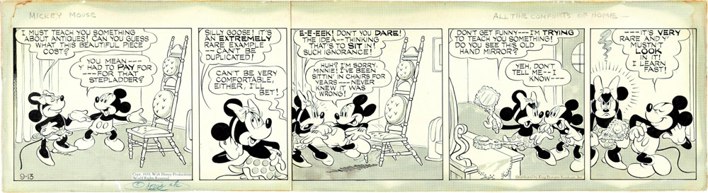 (Mickey Mouse the Miracle Master) Striscia giornaliera del 13 settembre 1939 per la storia realizzata dal grande Maestro tra l’11 settembre ’39 ed il 13 gennaio ’40. Matita china e retino su cartoncino cm 66x17,5. Eccellente stato di conservazione; di assoluta rarità questi originali per le storie del periodo d’oro.