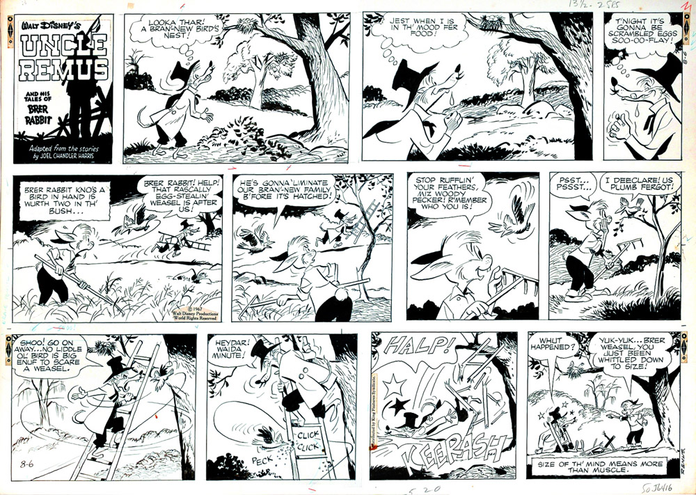 Tavola domenicale del 6 agosto 1967 scritta da Jack Boyd, matita e china su cartoncino cm 70x50. Ushler lavorò negli anni ’50 come disegnatore d’avventura per la Dell. Per la Disney realizza fumetti avventurosi come “L’Isola del Tesoro”; “Davy Crockett” e “Zorro”. Porta il suo stile intenso e dinamico, caratterizzato da forti contrasti tra chiaro e scuro, anche nell’universo Disney, realizzando tavole domenicali per “Lillo” e “Le storie dello Zio Remo”. Eccellente stato.
