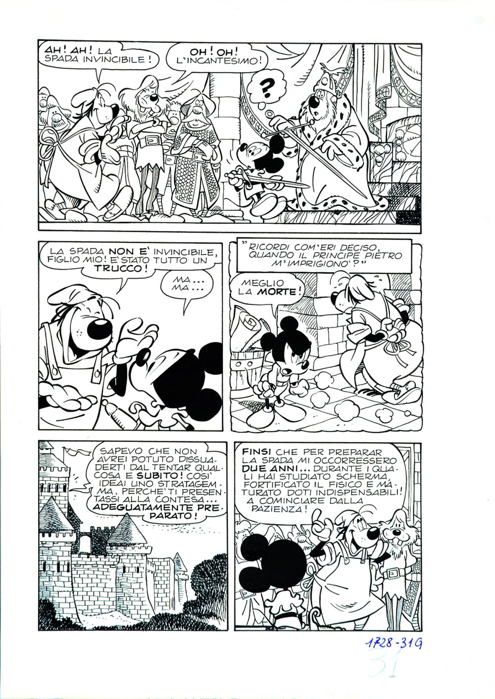 Tavola originale n° 31 pubblicata su “Topolino” n°1728 del gennaio 1989 su testi di M. Marconi. Matita e china su cartoncino cm 22,5x32,5. La storia, rimasta memorabile, ci presenta un giovane Topolino al tempo dei cavalieri.