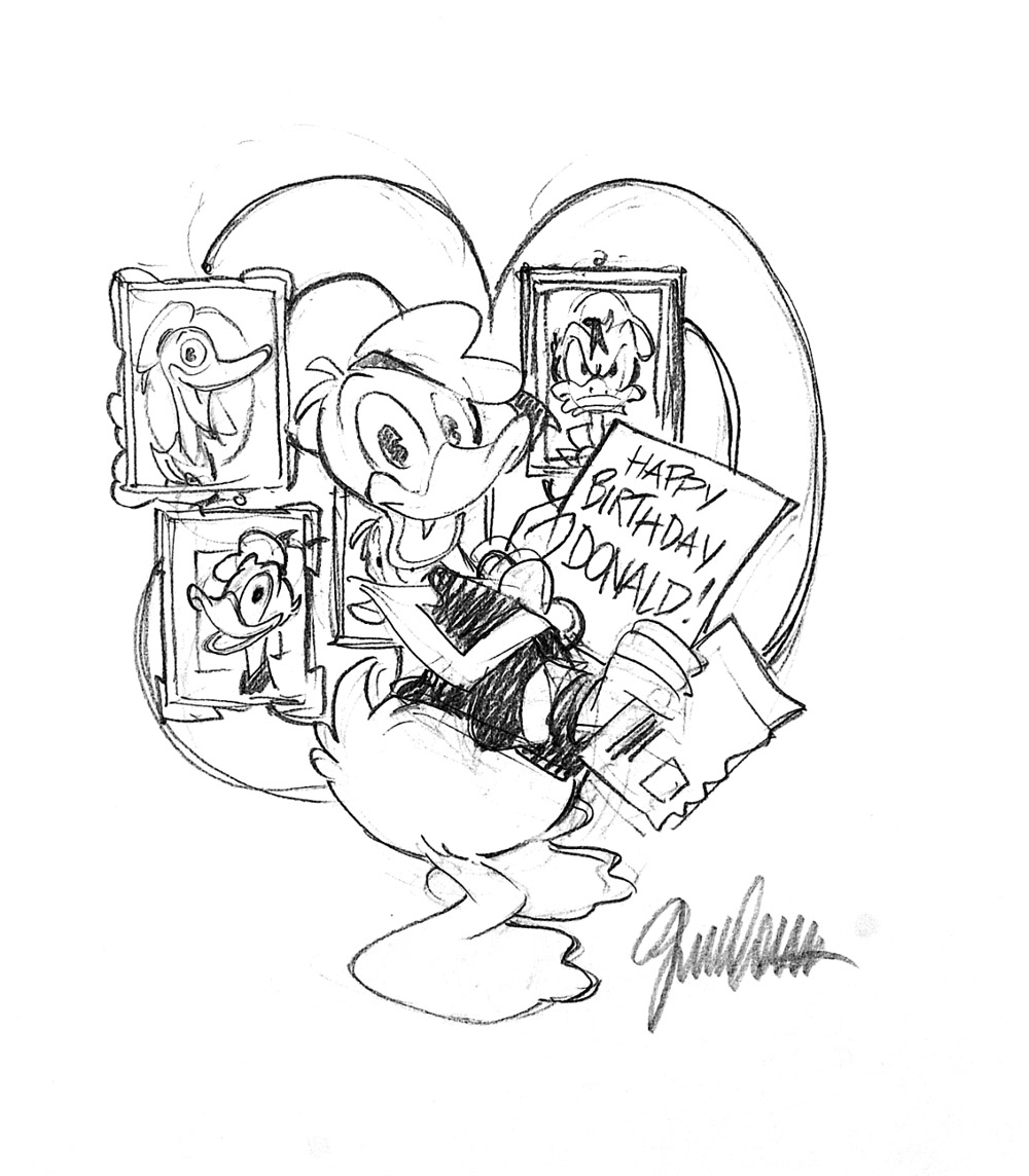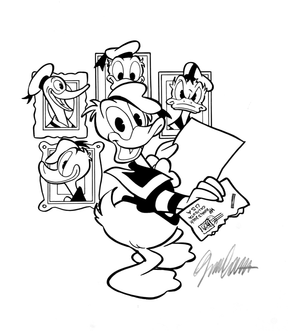 Copertina celebrativa realizzata per la Finlandia. Accompagnata dal bozzetto a matita, entrambi su cartoncino cm 20x30 e firmati. Cavazzano realizza un sintetico e efficace omaggio all’irascibile papero raffigurato nei vari “stadi di sviluppo”. Eccellente stato.