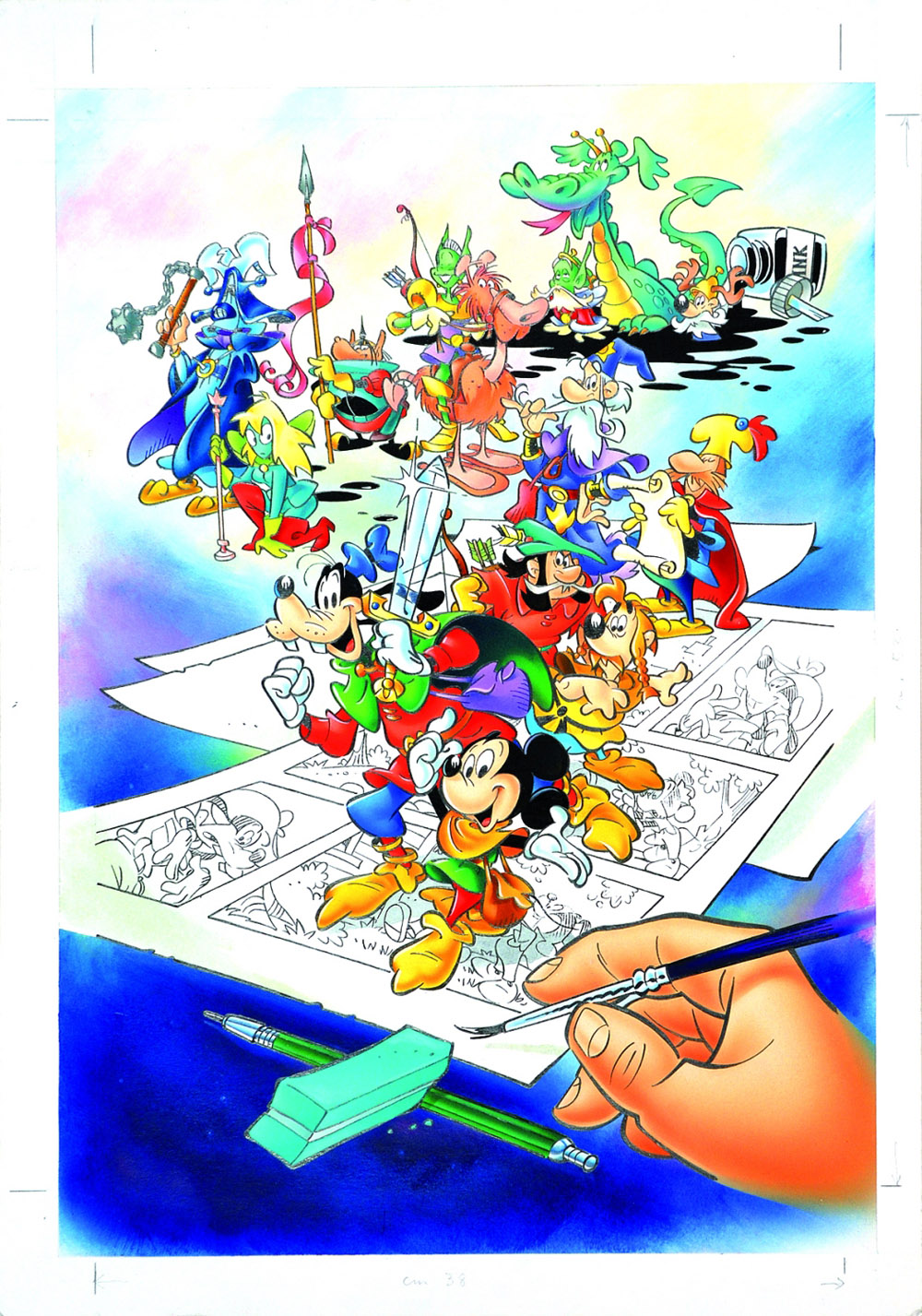 Originale per la litografia distribuita alle convention Disney. Spettacolare illustrazione tecnica mista su cartoncino cm 30x40. Per una delle storie memorabili degli anni ’80 ed una delle migliori prove di De Vita, realizzatore di soggetto e sceneggiatura con l’aiuto di Fabio Michelini. In eccellente stato.