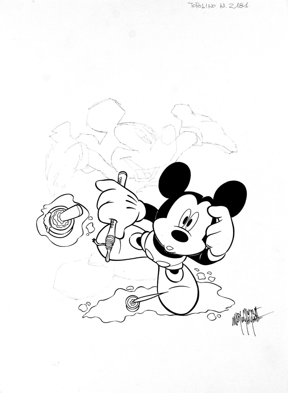 del settembre 1997. Matita e china su cartoncino cm 25x35, firmata. Attivo alla Disney sin dagli anni ’90, grazie al suo stile fresco e incisivo è apprezzato copertinista di testate come “Topolino”, “Paperinik”, “Topomistery” e “Mega 2000”. In eccellente stato.