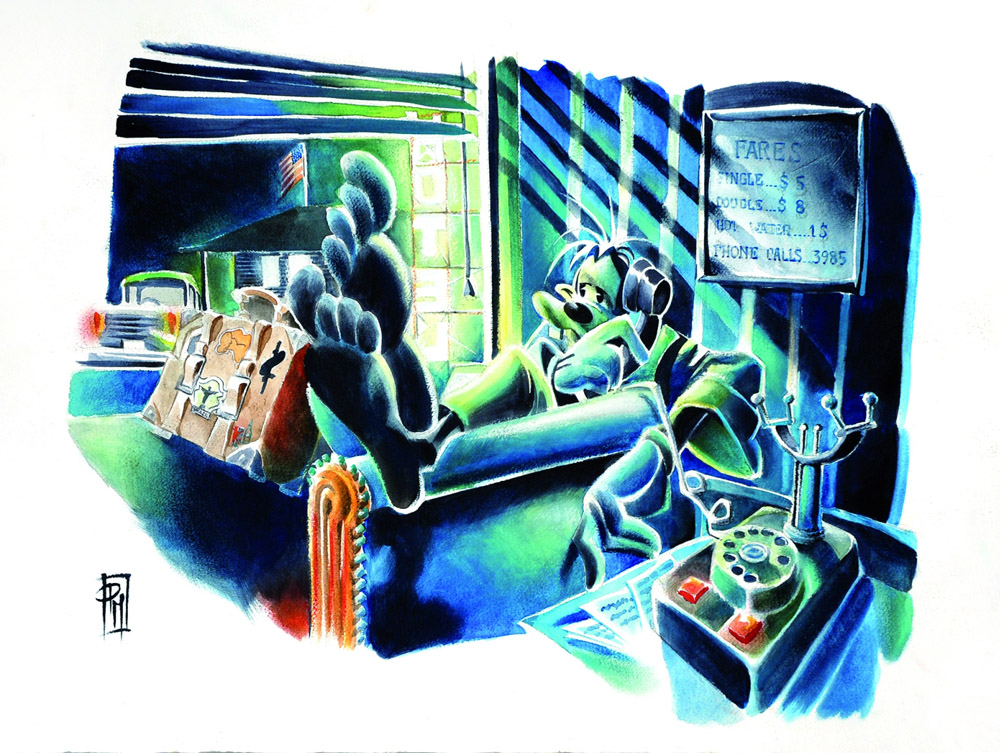 Illustrazione per il cartonato On the Road pubblicato da Panini nell’ottobre 2015. Tecnica mista su cartoncino cm 56x38. Uno dei più originali artisti Disney italiani. Collabora a “Topolino”, “Minnie and Co.”; “Paperinik”, e “PKNA” sin dal 1989. Insignito nel 1998 del Premio Topolino d’Oro, collabora con testate come “Il Sole 24 Ore” e “La Stampa”. Per Les Humanoides Associés ha realizzato la serie “Careme” (Premio Uderzo 2005). Disegna con Fabio Celoni l’adattamento a fumetti del videogioco “Epic Mickey”. Per Bonelli firma una storia di “Dylan Dog”. Presentato a Lucca quest’anno il volume speciale On the Road da cui è tratta questa illustrazione. Firmato