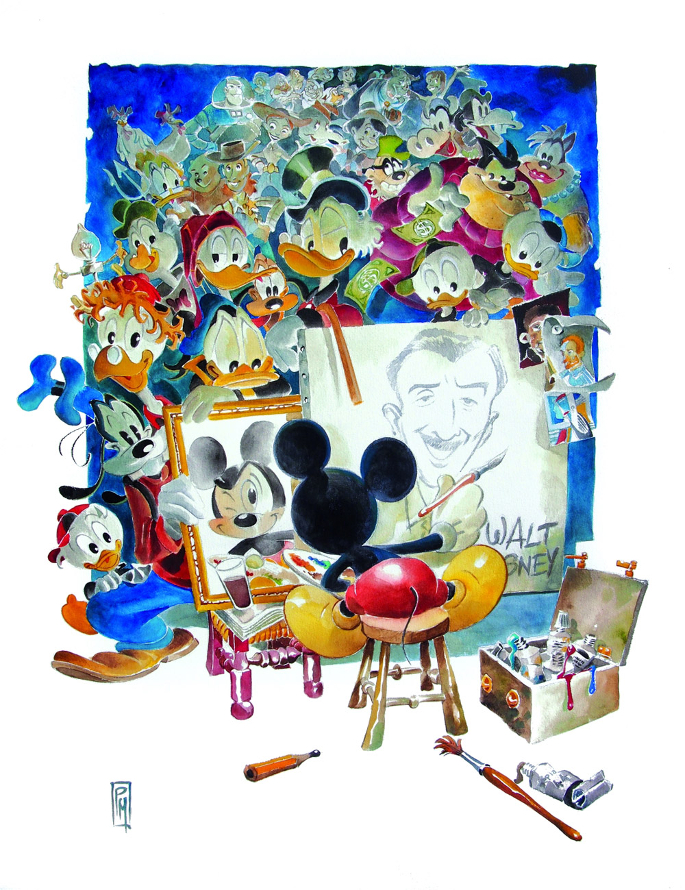 Grande illustrazione acquerello su cartoncino cm 56x74. Autore dotato di una cultura iconografica sconfinata, Mottura è capace come nessun altro di contaminare le creazioni Disney con rimandi a romanzi e film cult del Novecento. Si veda, a testimonianza di quanto affermato, l’incredibile lavoro per l’Associazione “La Nona Arte” e presentato a Lucca Comics and Games 2015. Firmato.