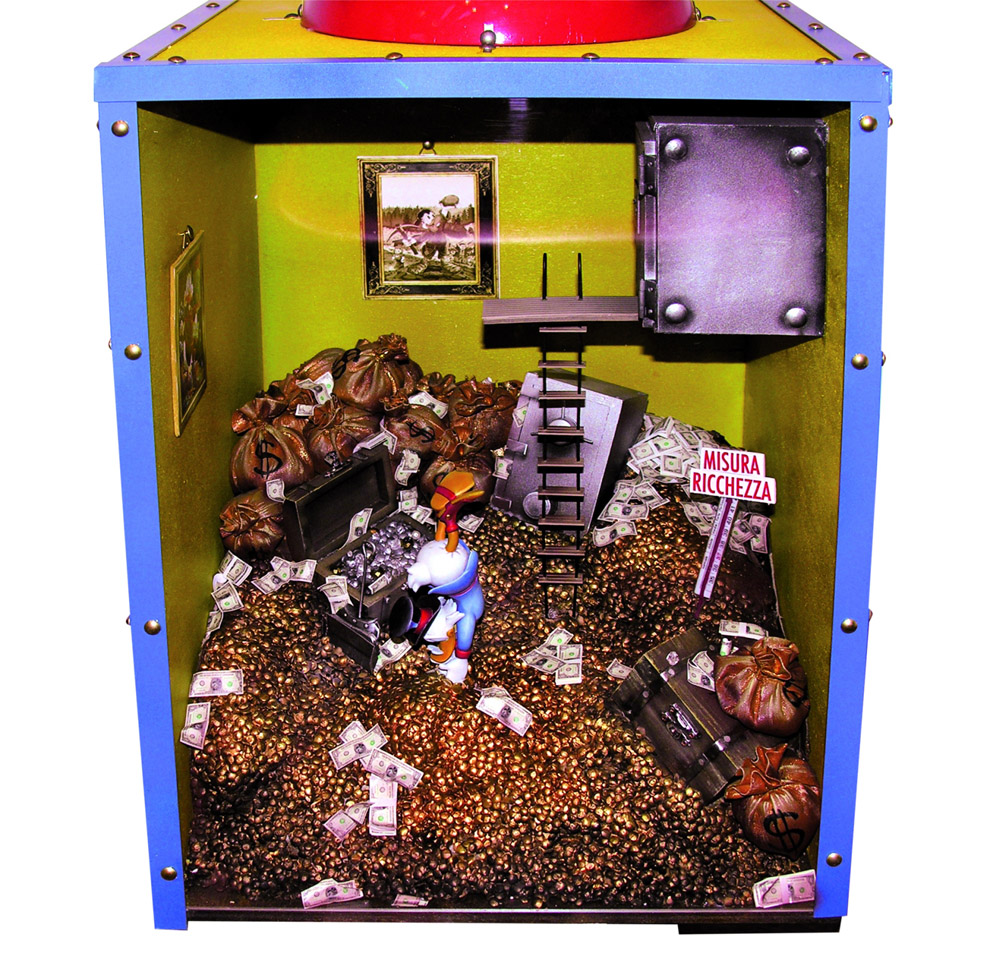 Artist recreation of Scrooge’s Money Bin. Mixed media, cm 50x50xh90.