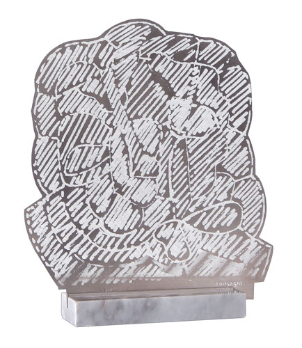 PIETRO CONSAGRA Mazara del Vallo (TP) 04/10/1920 - 16/07/2005 Senza titolo scultura in acciaio inox traforato cm. 26x22x5 con base in marmo. esemplare 152/300, firma traforata in basso a destra, pubblicata sul catalogo "I multipli di Consagra", a cura di Giuseppe Appella, Edizioni della Cometa (Roma), 1995. al numero 52/e.