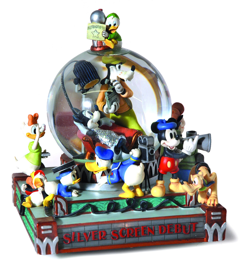 Globo musicale con luce, la scena in stile anni ’20 include i personaggi Disney su un set cinematografico la cui star è Minnie, al centro del globo trasparente. “There’s no business like the show business” è la musica di accompagnamento. Perfetto.