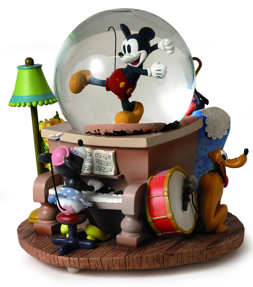 carillon a carica meccanica che riproduce la canzone “Minnie’s Yoo Hoo”, Topolino nel globo ruota circondato da note musicali; nella base Paperino, Pippo, Pluto e Minnie al pianoforte, diametro e altezza cm 20. Perfetto stato di conservazione.