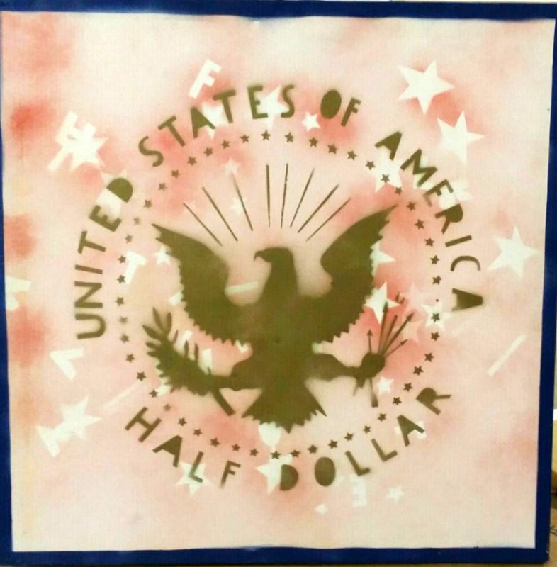 Franco Angeli "Half Dollar" smalti su tela cm 80x80.anni 80 Archivio Franco Angeli di Angiolino Calestani. Opera pubblicata sul catalogo generale