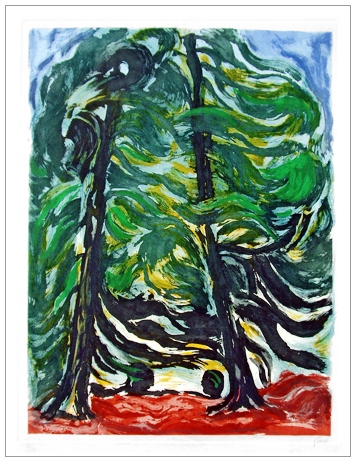VIRGILIO GUIDI Roma 1891 – Venezia 1984 Alberi Acquaforte e acquatinta a colori es.7/75. Firma e timbro a secco Editrice Grafica Dei Greci, Roma in b. a d.; sul verso etichetta Editrice Grafica Dei Greci, Roma. (84,4 x 70 foglio – 60,5 x 45,5 inc.) B.A.: 100