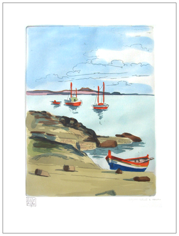ALDO RISO Santa Maria di Leuca 1928 – Roma 2008 Costa del Cilento Acquerello su base litografica 50 x 35. Firma in b. a s., titolo in b. al c., tecnica in b. a d. B.A.: 70
