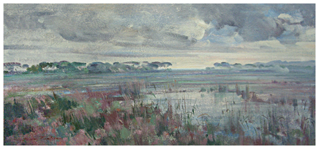 GIULIO DA VICCHIO Vicchio di Mugello 1925 – Livorno 2004 Grigio (tra Livorno e Pisa) Olio su tela 35 x 75,2. Firma in b. a s.; sul verso scritte “T.O.S.C.V.”, titolo e firme. B.A.: 490