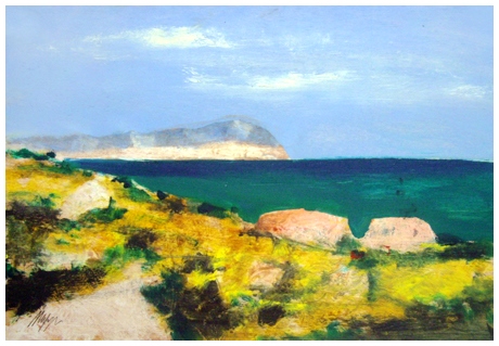 SALVATORE MAGAZZINI Pistoia 1955 Marina Olio su tavola 25 x 35. Firma in b. a s.; sul verso titolo, scritta di autentica e firma. B.A.: 130