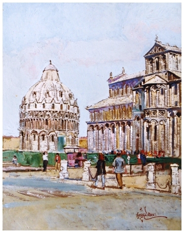FRANCO MAZZACCHERINI La Spezia 1939 – Livorno 1999 Piazza dei Miracoli Olio su pannello 50 x 40. Firma in b. a d.; sul verso titolo e firma. B.A.: 250