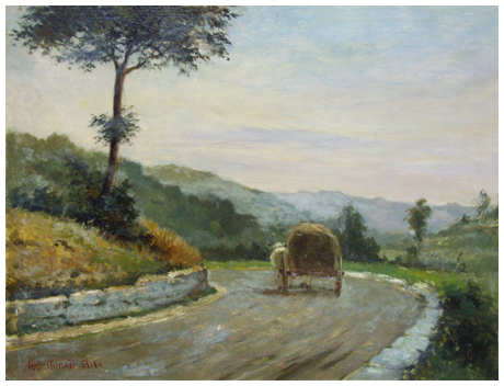 ALDO AFFORTUNATI Castelnuovo Garfagnana 1906 – Castelnuovo Garfagnana 1991 Senza titolo (Campagna toscana) Olio su cartone 35 x 46. Firma in b. a s.; sul verso ritaglio di carta con nome dell’artista e titolo. B.A.: 120