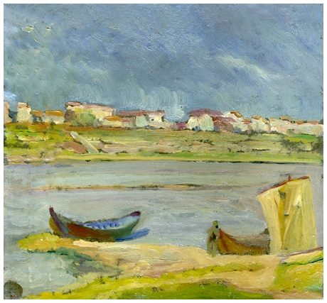 SANTI MACCHIA Pisa 1884 – Pisa 1964 L’Arno con Porta Fiorentina sullo sfondo Olio su zinco 23 x 23,5. Pubbl.: “Santi Macchia” cat. mostra a cura di Silvio Guarasci, Saletta Viviani, Pisa, 24 novembre 2001 – 13 gennaio 2002, p.51. B.A.: 400