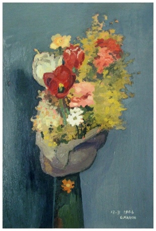 GIOVANNI MARCH Tunisi 1894 – Livorno 1974 Fiori 1964 Olio su faesite 70 x 45. Data e firma in b. a d.; sul verso dedica e firma + timbri illeggibili. Pubbl.: “6° Rassegna Internazionale di Arte Contemporanea” catalogo mostra, Firenze, 1972, sezione dedicata a Giovanni March. B.A.: 700