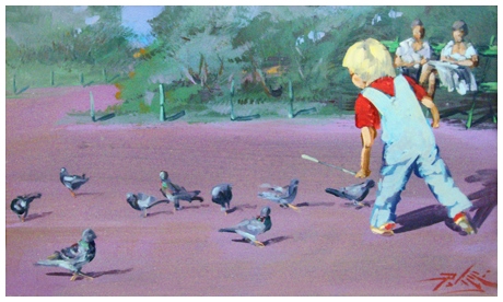 LORENZO PALAZZI Livorno 1921 – Livorno 1990 Senza titolo (Bimbo e piccioni ai giardini di Montecatini) 1960 Olio su faesite 30 x 50. Firma in b. a d.; sul verso data e firma + certificato di autenticità e timbri galleria Casa d’Arte Toscana, Livorno + pagina stampata con biografia dell’artista. B.A.: 80
