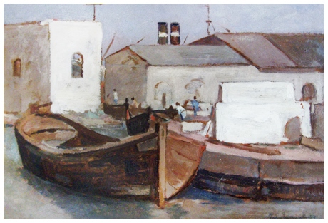 GHIGO TOMMASI Livorno 1912 – Livorno 1985 Livorno (Darsena d’acqua, deposito marmi) 1929 Olio su cartone 31 x 46. Firma e data in b. a d.; sul verso titolo e data + etichetta e timbri galleria Athena, Livorno + ritaglio di pagina con scritte + timbro e firma galleria Botteghina d’Arte Cantini, Castiglioncello. B.A.: 300