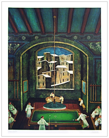 NORBERTO PROIETTI Spello 1927 – Spello 2009 Senza titolo (Il biliardo) Micrograna a colori es. Prova d’autore. Firma in b. a d.; sul verso timbro dichiarazione di autenticità e firma galleria Artitalia, Spello. (86 x 61 foglio – 70 x 54 lito.) B.A.: 200