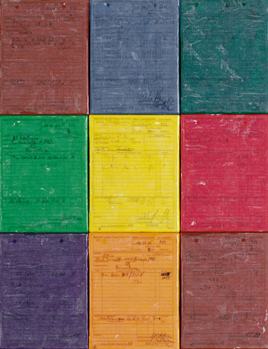 GIORGIO GOST Salsomaggiore (PR) 06/04/1962 N.1696 Pluri-bolle! Old Economy, 2011 olio, 9 documenti originali del 1982 resi trasparenti e resina su tela cm. 60x45 (20x15 cadauno), firma, anno e archivio dell'artista al retro, dichiarazione d'autenticità, timbro a secco e archivio dell'artista su foto, pubblicato sul mensile "Arte" Edizioni Mondadori, febbraio 2012.