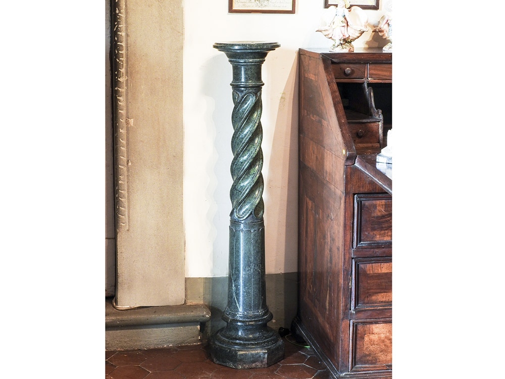 Colonna in marmo verde fusto a torciglione e scanalato nella parte inferiore,...