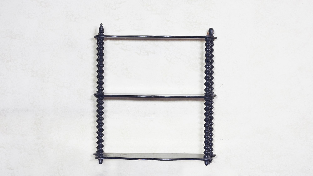 Étagère pensile in legno ebanizzato tre ripiani a giorno sagomati, montanti torniti, mancanze h cm 56x52x16