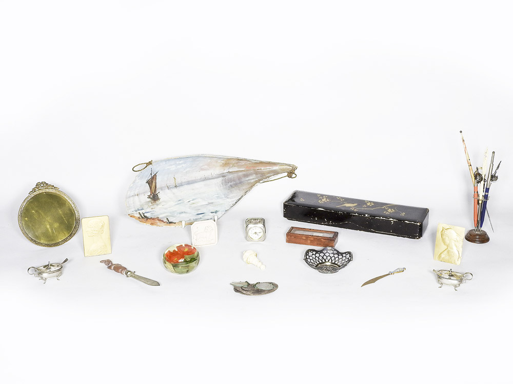 Lotto di curiosità tra cui una coppia di saliere in argento, un press papier...